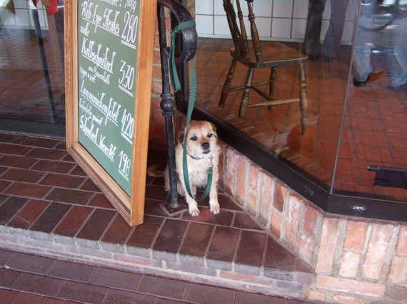 看板の影でけなげに御主人様を待つ犬w