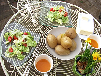 レタスとトマトのサラダと、新じゃがの茹でたやつよ。